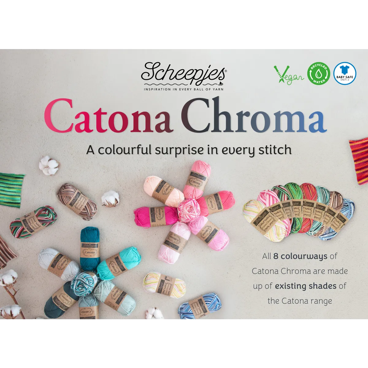 Scheepjes Catona Chroma is een prachtige meerkleurige variatie op het bijzonder populaire Scheepjes Catona. Het is een 100% gemerceriseerd katoenen garen met een subtiele glans en een gladde en zachte afwerking. Catona is de vertrouwde keuze voor het maken van amigurumi, (kinder)kleding, knuffels, speelgoed en mode- en woonaccessoires. Scheepjes Catona en Scheepjes Catona Chroma zijn in samenstelling en kwaliteit identiek en bovendien zijn de kleurvariaties van Catona Chroma gebaseerd op de bestaande kleuren van de Catona reeks. Hierdoor zijn de garens perfect te combineren en geef je projecten een verrassend vleugje kleur. In het overzicht hieronder kun je zien welke Catona kleurnummers verwerkt zijn in elke Catona Chroma kleurstelling: